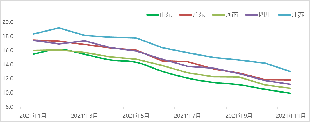 圖3 2021年1-11月豬肉主供省份電商市場價格走勢(元/斤)?